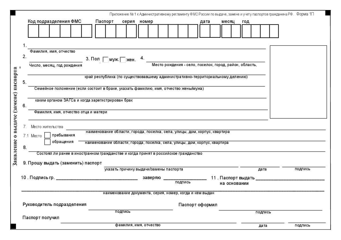 - Стандартная форма заявления номер 1П. Форма может быть заполнена на компьютере или вручную. Фамилию при заполнении следует указывать действительную, то есть принятую после брака. Саму форму можно загрузить с сайта Госуслуг или МВД, а также увидеть на стенде в паспортном столе. При отсутствии ее следует запросить у ответственного сотрудника;