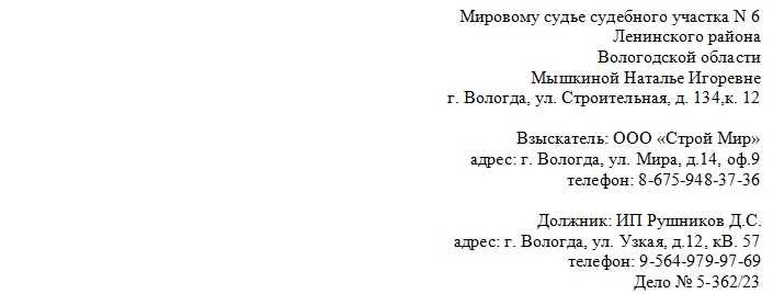 Далее примерно аналогичным образом указывается информация о взыскателе и ответчике: с указанием их полных наименований (если это организации), ФИО (если это физические лица), а также адреса и телефона (на случай, если у судьи возникнут какие-либо вопросы по делу).