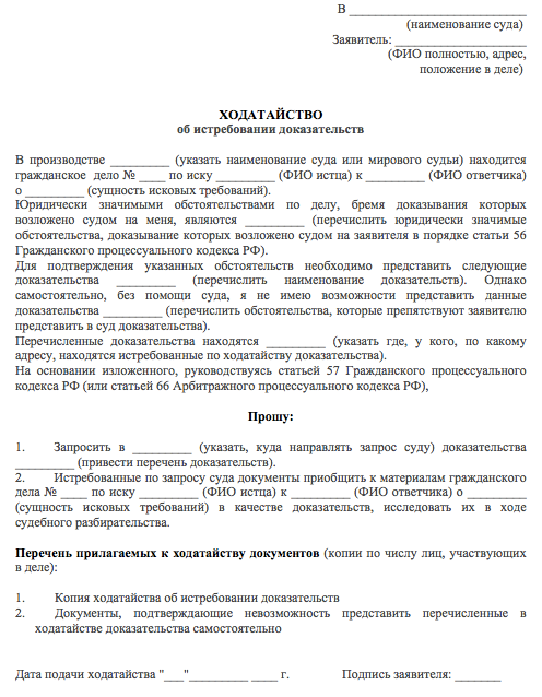Для корректного составления процессуального документа можно использовать образец ходатайства об истребовании документов и доказательств.