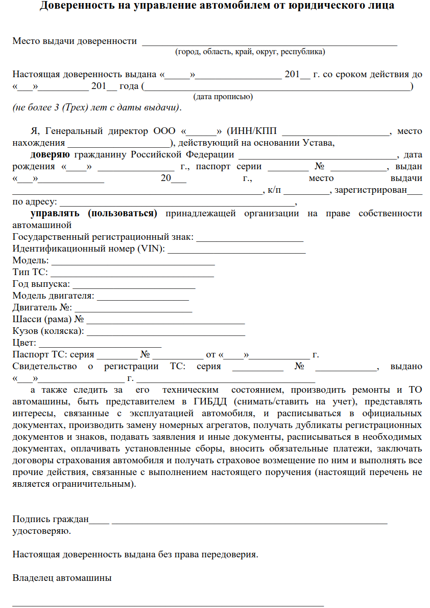 Именно их может попросить предъявить сотрудник ГИБДД. Доверенность на управление автомобилем от юридического лица сотрудники ДПС не имеют права потребовать. Однако в страховом полисе должны быть указаны все необходимые сведения о лице, управляющем ТС. Таким образом, с введением обязательного автострахования практика оформления письменной передачи полномочий постепенно отмирает. По крайней мере, эта тенденция прослеживается в части управления ТС. Что касается осуществления иных действий с автомобилем, для них по-прежнему необходимо оформлять этот документ. Кроме того, его стоит оформить, если планируется выезд ТС в другой регион или другую страну.