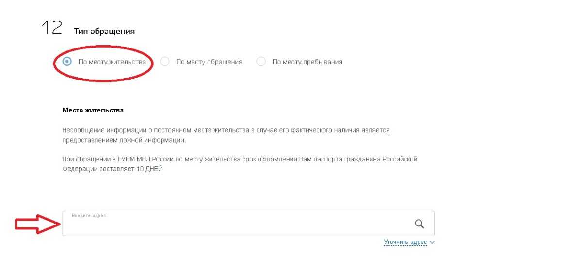 Шаг 10. Укажите тип обращения «По месту жительства» и введите адрес в появившемся поле.