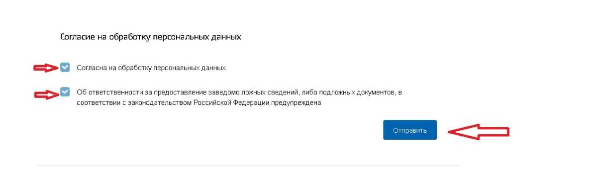 Шаг 12. Заполнив электронное заявление, тщательно просмотрите все внесенные данные. После чего дайте согласие на обработку персональных данных, проставив галочки, и нажмите кнопку «Отправить».