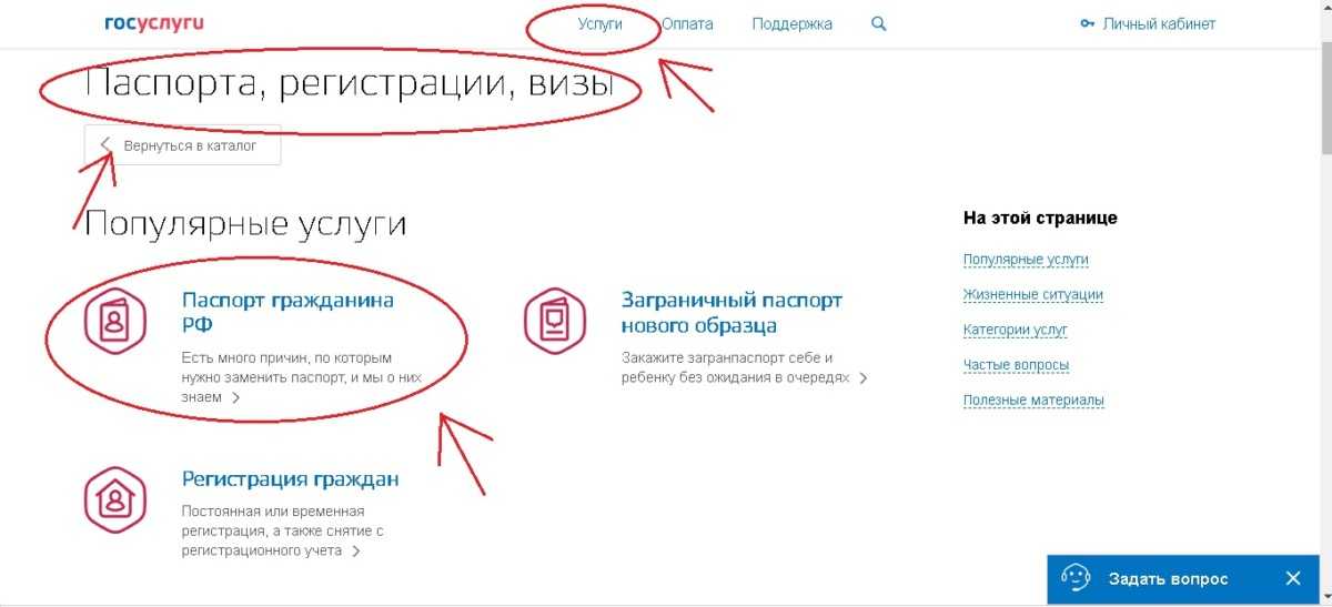 Шаг 2. Зайдите в раздел «Услуги», выберите «Паспорта, регистрации, визы», а затем «Паспорт гражданина РФ».