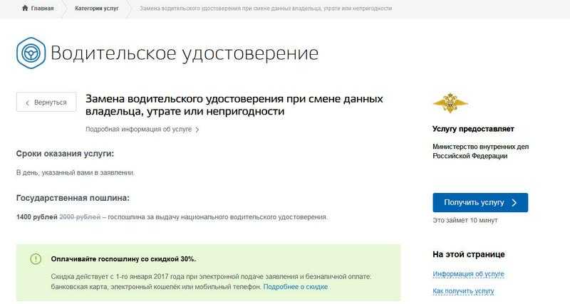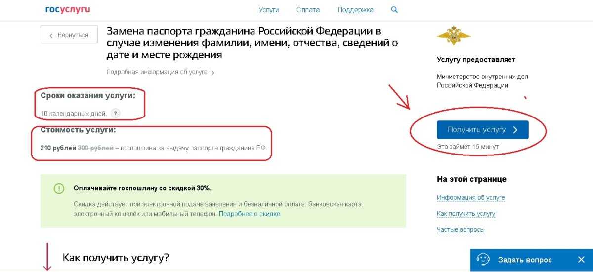 Далее откроется страница, содержащая справочную информацию о замене паспорта с указанием суммы, которую потребуется внести в качестве государственной пошлины.