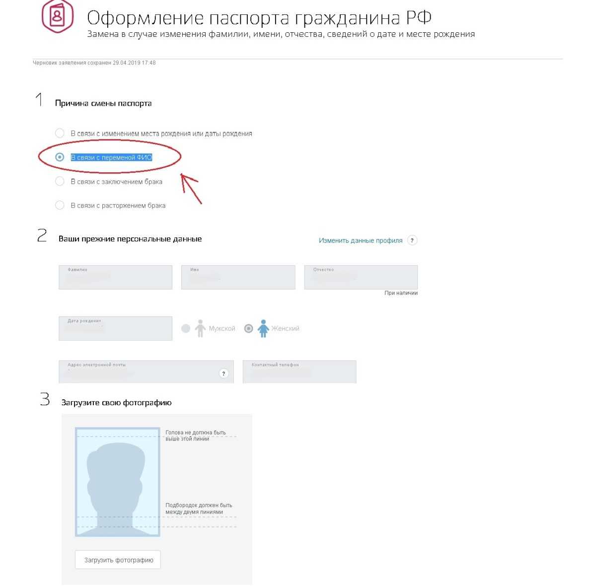 Шаг 5. Укажите причину замены документа » В связи с переменой ФИО», после чего введите свои личные данные и прикрепите фото необходимого формата.