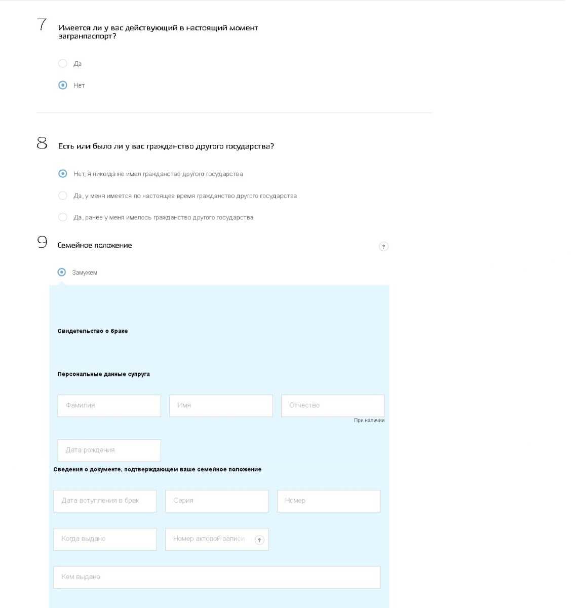 Шаг 7. Отметьте присутствует ли у вас действующий в настоящий момент загранпаспорт, внесите информацию о гражданстве и статусе семейного положения.