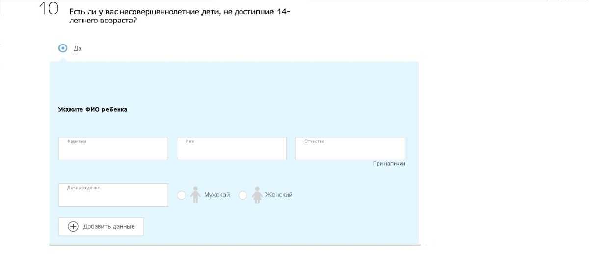 Шаг 8. Укажите имеются ли у вас дети не достигшие четырнадцатилетнего возраста. Если да, то внесите сведения о них.