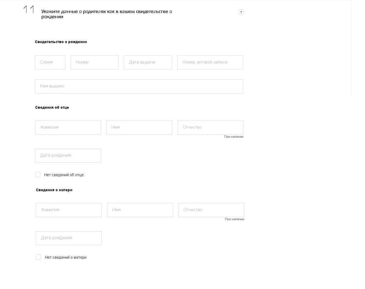 После выбора основания откроется страница, где нужно будет заполнить личные данные: ФИО, дату и место рождения, адрес электронной почты и телефон для связи. Нужно будет также внести данные о прописке на территории РФ и сведения о родителях, указать семейное положение, отметить, где планируется получение нового документа.
