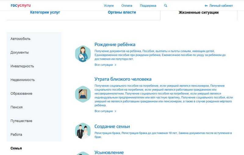 Затем выбрать «Жизненные ситуации», перейти на «Семья» и на «Замену документов после вступления в брак».