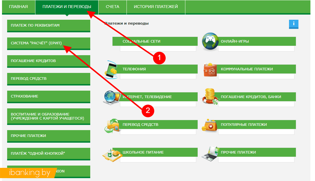 Система действует с 2008 года и учреждена работниками Национального банка РБ. Перевод денег через ЕРИП производится в интернет-банке. Для этого клиент должен зарегистрировать личный кабинет в Беларусбанке. Далее необходимо реализовать такие шаги: