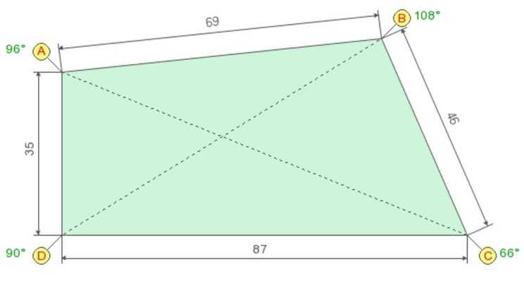 По этим данным можно определить длины диагоналей B-D и A-C, и рассчитать площадь участка = 3035 квадратных метров (или 30,35 соток).