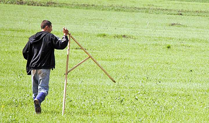 Есть и более продвинутый способ применения этого способа, когда из трех палок делается тренога или, как еще называют, «сажень». По опыту скажем, что измерять участок сажнем выходит намного быстрее.