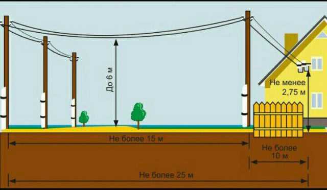Высота проводов должна быть на уровне не менее 2,75 метров от земли. При пересечении транспортных и пешеходных путей – 6 метров.