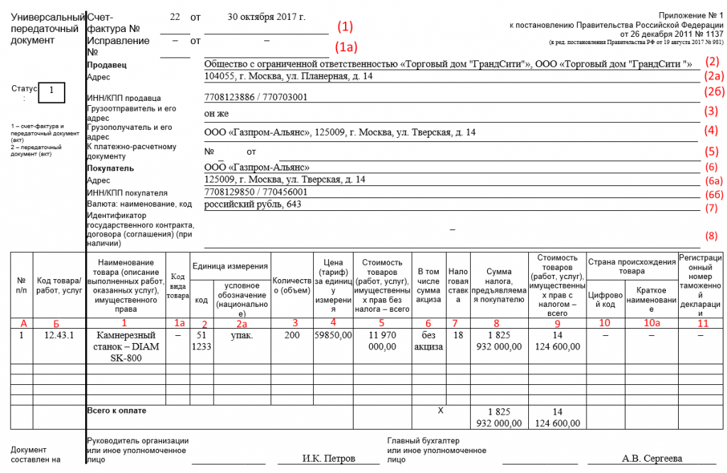 Когда же УПД заполняется по первому варианту, то есть не только как первичный документ, но и как счет-фактура, то показатели счета-фактуры, установленные ст. 169 НК РФ и Постановлением N 1137 от 26.12.2011, должны заполняться в нем полностью. Соответственно заполняются суммы налога, акциза, наименование страны товара и другие обязательные сведения.