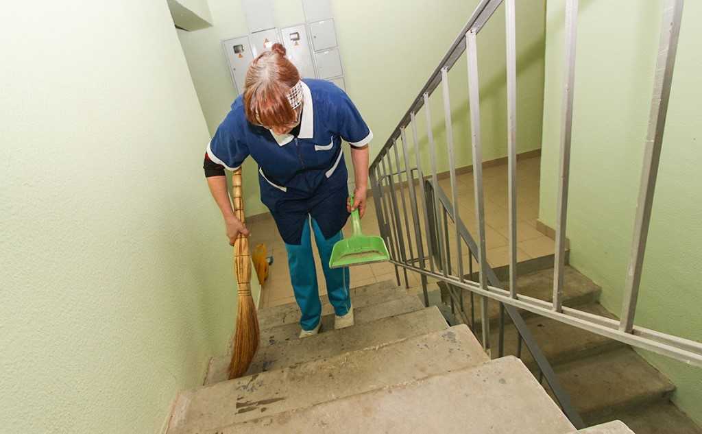 - раз в неделю подметает мокрым веником или щёткой лестничные клетки и марши третьего и последующих этажей;