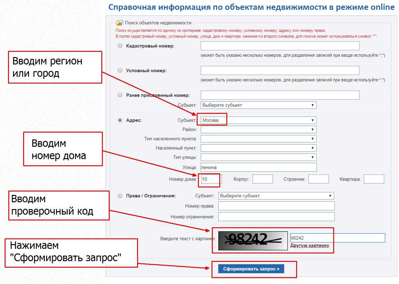 2. Заходим на сайт Росреестра в раздел «Справочная информация по объектам недвижимости в режиме online«: Выбираем регион, город, вводим название улицы, номер дома и проверочный код, нажимаем кнопку «Сформировать запрос».