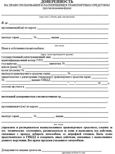 Доверительная бумага с правом пользования и распоряжения транспортным средством предполагает оформление ее в случае передачи прав на совершение простых действий с автомобилем – заботы о его техническом состоянии, возврата со штрафной стоянки и другие. Перечень полномочий прописывается в оформленной бумаге.