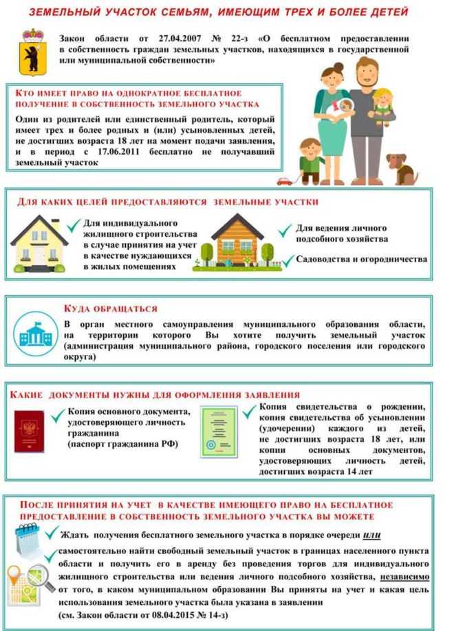 - Граждане, имеющие трех и более детей, если они соответствуют условиям для предоставления им земли (п.6 ст. 39.5 ЗК РФ). Условиями получения участка является наличие трех и более детей, прописка у детей и родителей должна быть по одному и тому же адресу, у такой семьи не должно быть в собственности недвижимости.