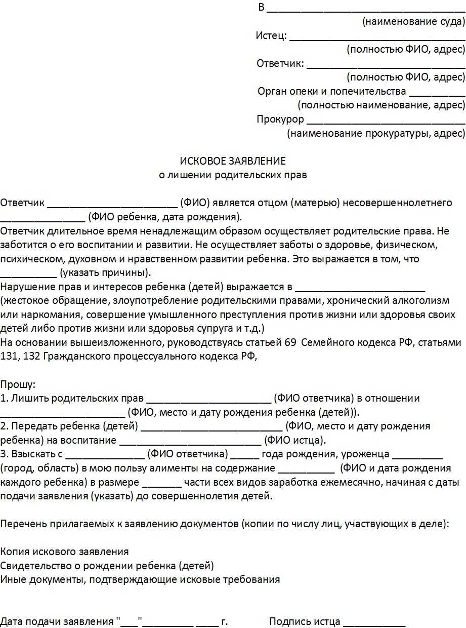 - Исковое заявление матери или любого другого допустимого к этому делу лица, в котором содержится просьба о лишении отца его родительских прав.