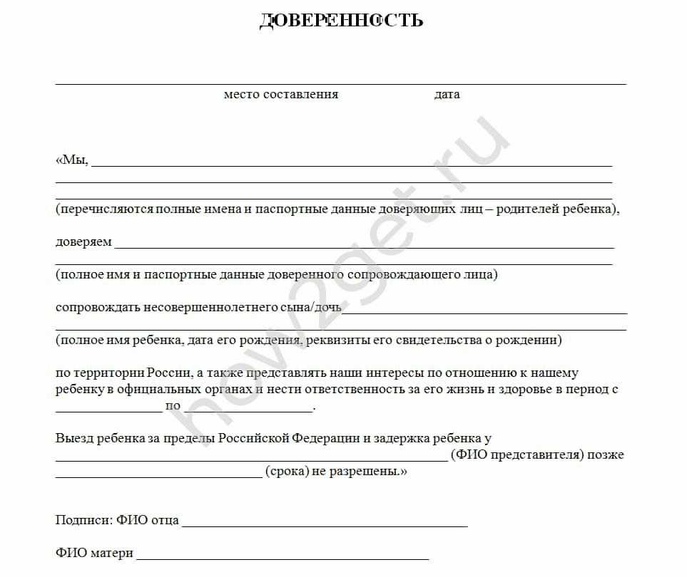 «Мы, (ФИО и данные паспортов обоих родителей), доверяем (ФИО сопровождающего и данные паспорта), сопровождать нашего ребёнка (ФИО, дата рождения, данные свидетельства о рождении/паспорта) по территории России, представлять наши интересы и нашего ребёнка во всех организациях и российских официальных органах, решать вопросы правового и медицинского характера и нести ответственность за его жизнь и здоровье на период с… по… Наш сын/дочь (ФИО) направляется в…»