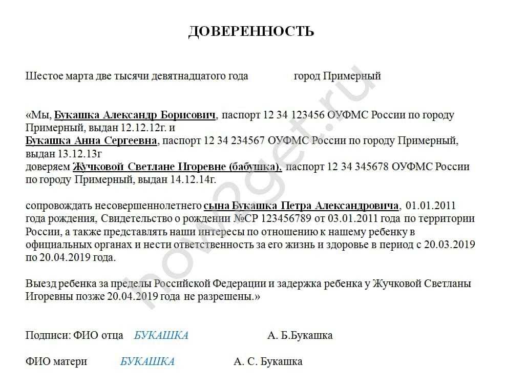 Мы, (перечисляются полные имена и паспортные данные доверяющих лиц – родителей ребенка), доверяем (полное имя и паспортные данные доверенного сопровождающего лица, то есть бабушки) сопровождать несовершеннолетнего сына/дочери (полное имя ребенка, дата его рождения, реквизиты его свидетельства о рождении) по территории России, а также представлять наши интересы по отношению к нашему ребенку в официальных органах и нести ответственность за его жизнь и здоровье в период с ____ по ______.