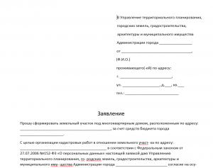 - в самом тексте заявления нужно описать просьбу о формировании земельного участка, на котором расположен многоквартирный дом и адрес объекта;