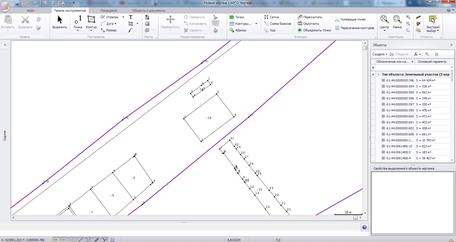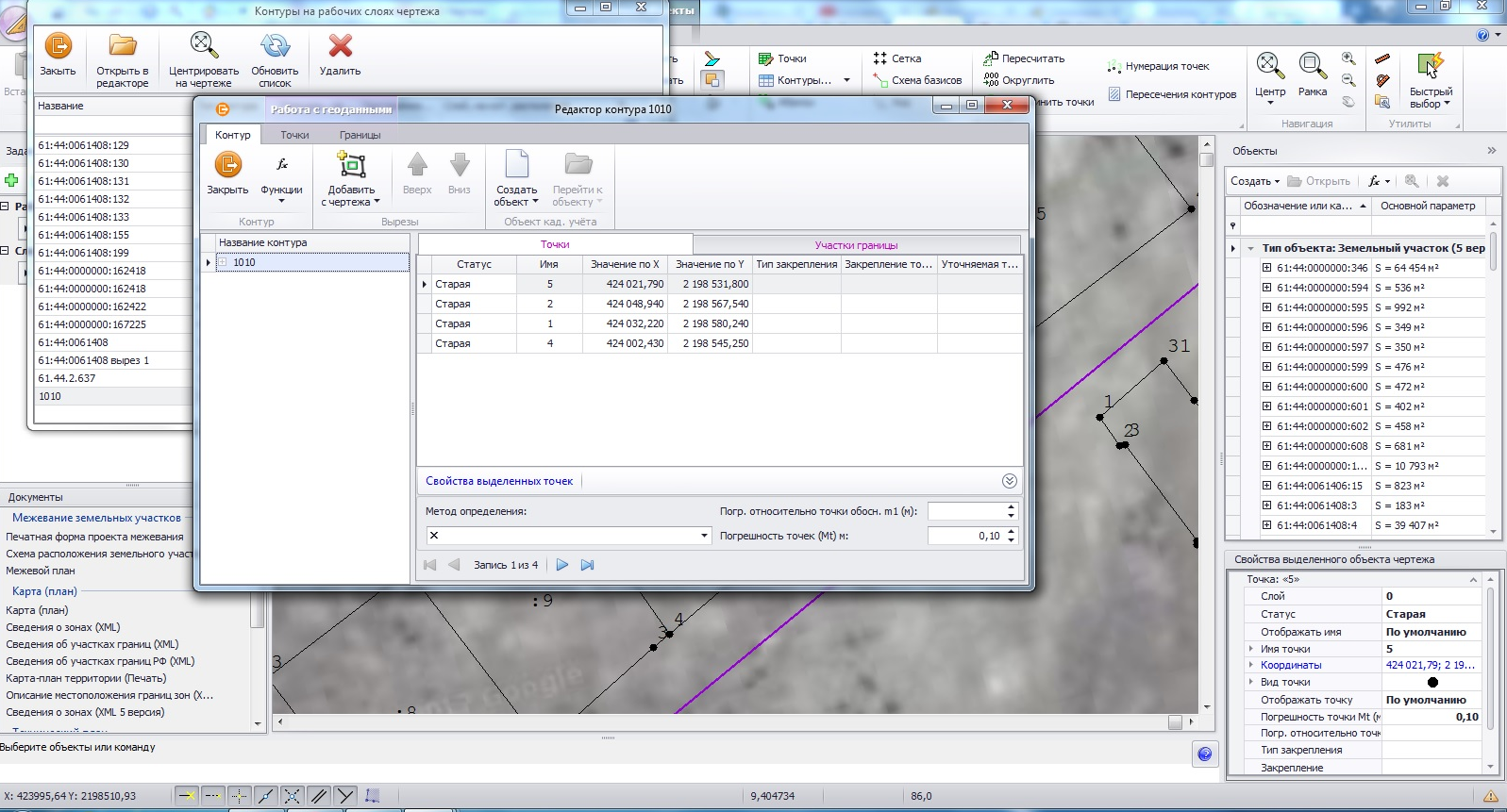 После того как Вы отметите точками контуры участка, программа автоматически рассчитает его площадь и отобразит координаты всех точек.