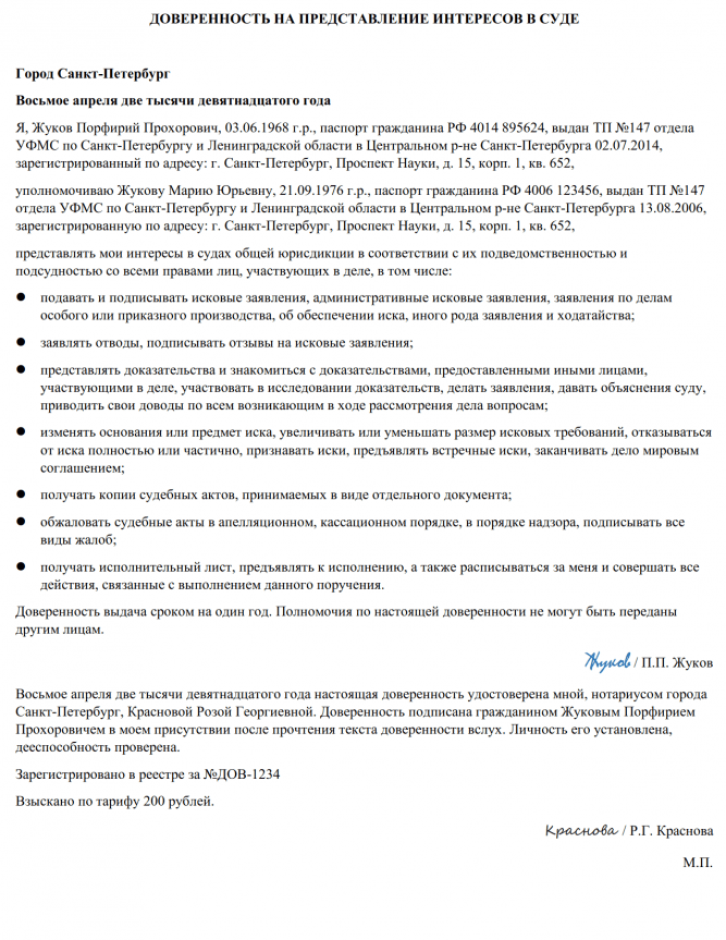 В последние годы доверенность на предоставление интересов чаще всего используется в судебных разбирательствах. Такая доверенность составляется, как и любая другая, в произвольной письменной или печатной форме, выдается физическим лицом и по желанию удостоверяется нотариально.