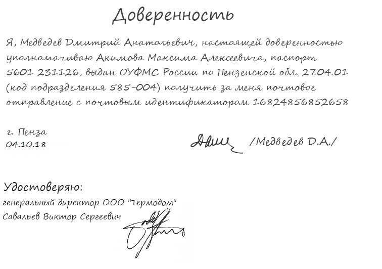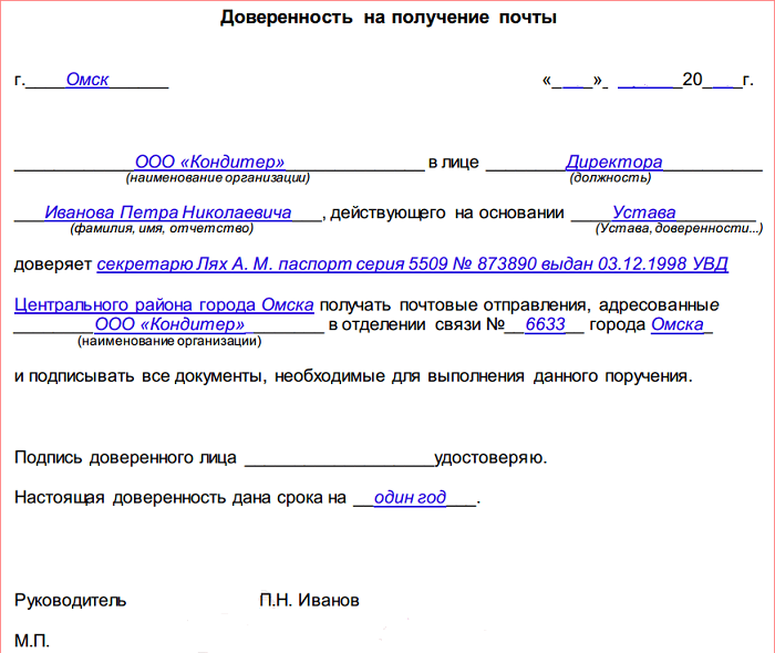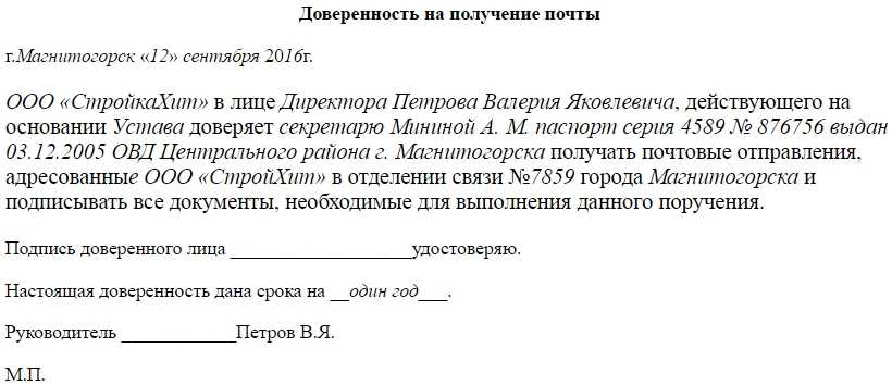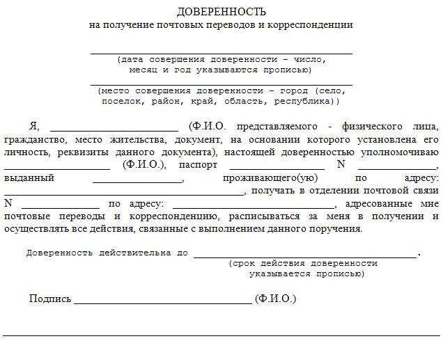 Образец доверенности на получение корреспонденции “Почта России” в 2020 году