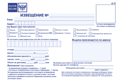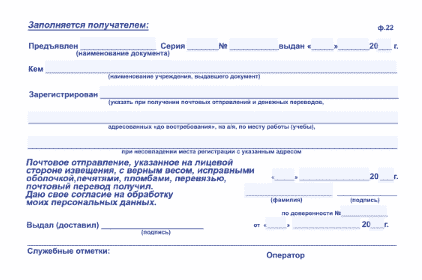 - Получив извещение, заполненное служащим почтамта на месте, для приобретения отправления понадобится заполнить оборотную сторону извещения. При этом, обычно, почтовый служащий просит, чтобы адресат сразу поставил подпись в приобретении корреспонденции.