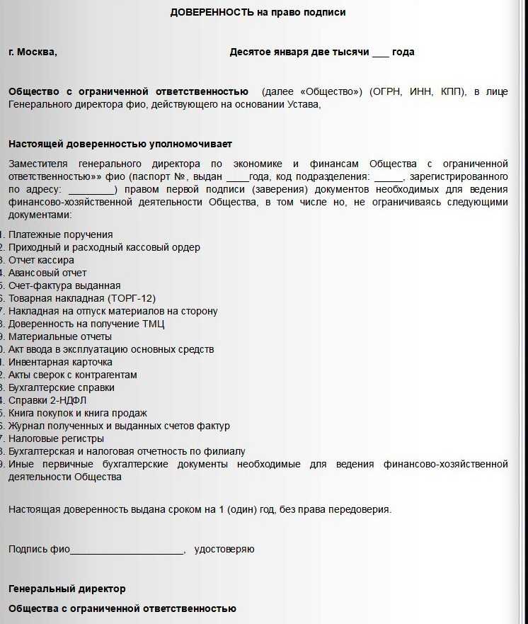 Общество с ограниченной ответственностью ( далее Общество) ( ОГРН, ИНН, КПП), в лице Генерального директора фио, действующего на основании Устава, Настоящей доверенностью уполномочивает Заместителя генерального директора по экономике и финансам Общества с ограниченной ответственностью фио ( паспорт №, выдан ____года, код подразделения: _____, зарегистрированного по адресу: ________) правом первой подписи ( заверения) документов необходимых для ведения финансово-хозяйственной деятельности Общества, в том числе но, не ограничиваясь следующими документами: