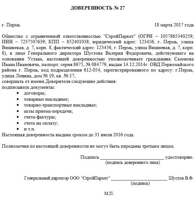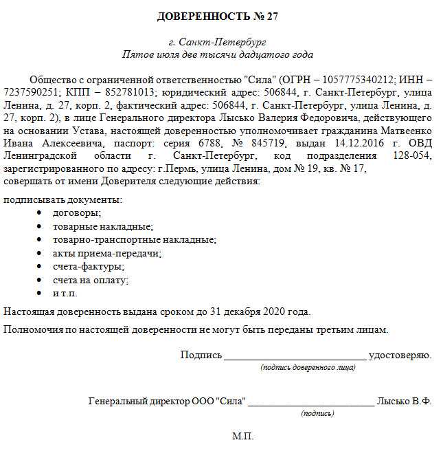 Образец доверенности на право подписи документов от юридического лица 2020 года