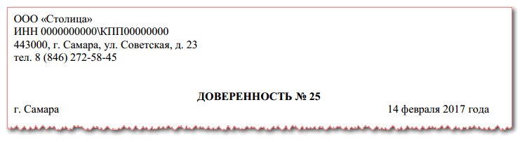 - юридические реквизиты организации, выдавшей доверенность (наименование без сокращений, ИНН, КПП, юридический адрес, контактные телефоны). Документ можно составить на бланке организации, где в штампе содержится достаточное количество реквизитов;