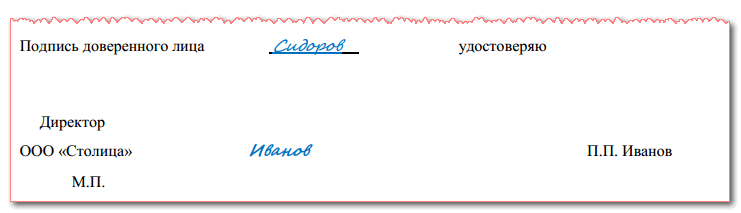 - Далее доверенное лицо ставит под документом свою подпись, которую удостоверяет руководитель организации. Последний также расписывается под доверенностью и ставит печать предприятия.