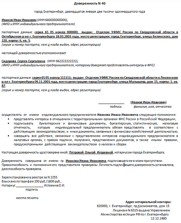 Когда ИП передает доверенности представителю, там указывается, какими правами первый наделяет второго. Чаще всего требуется составление документа для того, чтобы представитель заключил от имени предпринимателя договор или получил услугу. Документ можно свободно отправлять по почте, если это возможно, но чаще всего он отдается лично в руки. Часто это требуется при передаче товара или денег. Иногда банки и другие организации трепетно относятся к подтверждающим права бумагам и проводят свои процедуры идентификации ИП.