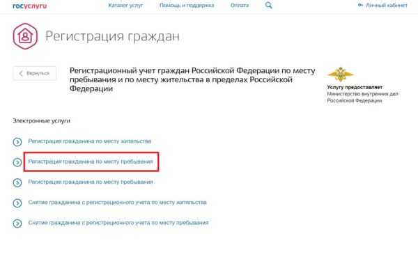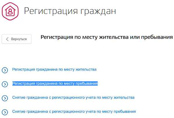 На следующем этапе система спросит у нас какое именно действие мы хотим выполнить. Выбираем пункт «Регистрация гражданина по месту пребывания».