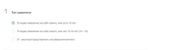 - Далее, укажите тип заявителя. Заявление можно подать на себя самого, если вы совершеннолетний гражданин или вам от 14 до 18 лет. Для оформления регистрации ребёнку, выберите графу о том, что вы являетесь его законным представителем.