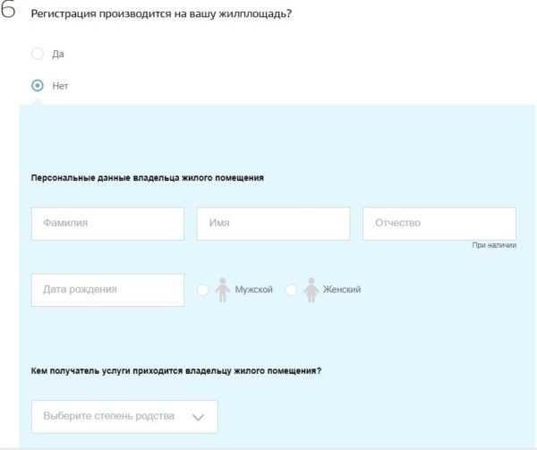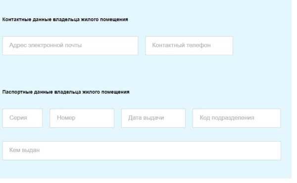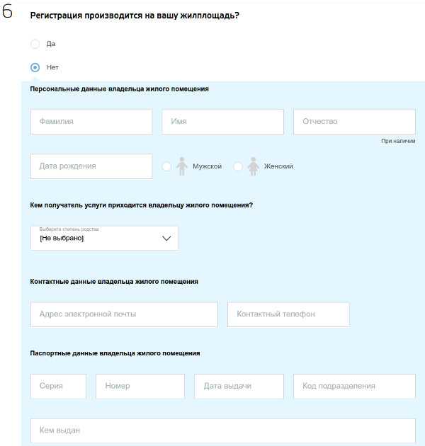 Теперь мы подошли к самому важному пункту заявления, а именно к заполнению данных о жилом помещении. Скорее всего, жилплощадь вам не принадлежит и нам понадобятся данные владельца квартиры. Заполните его фамилию, имя, отчество, кем вам является данный человек, а также его паспортные данные и контактный номер телефона. Вносите только достоверную информацию, так как она будет проверяться.