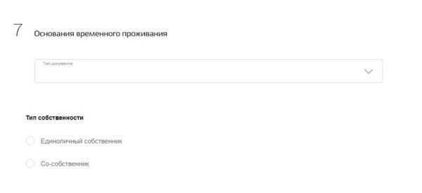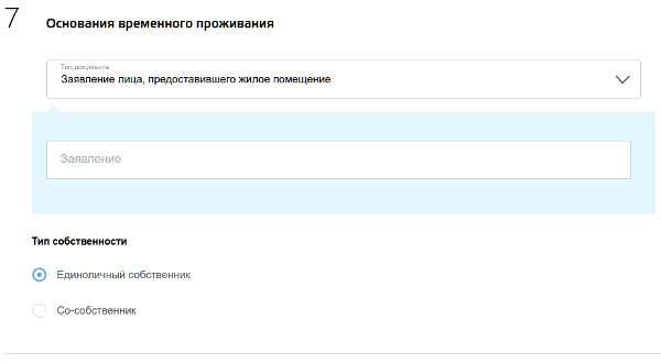 Теперь укажите основание для временного проживания. Это может быть договор найма или заявление собственника помещения. Помимо этого, нужно указать является ли данный человек единственным собственником жилья или имеются и другие.