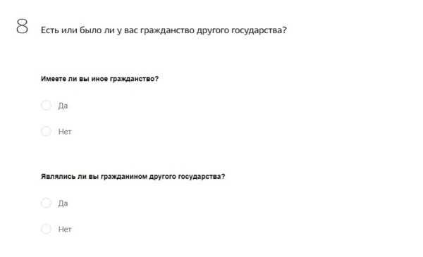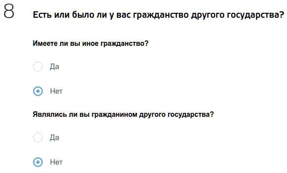 - В графе о дополнительном гражданстве, подтвердите, что являетесь или не являетесь гражданином другого государства.