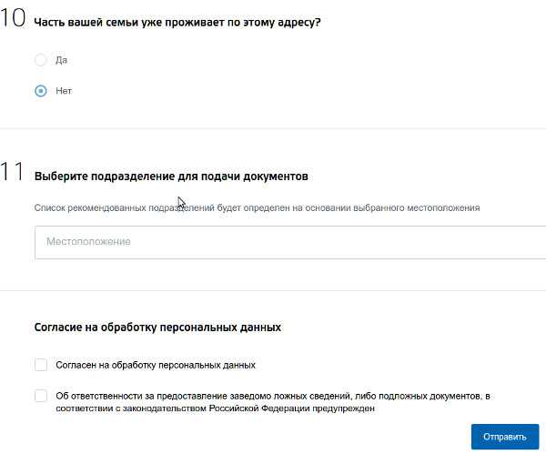 Укажите проживает ли ваша семья по данному адресу и выберите подразделение в которое будут поданы документы и заявление. Не забудьте установить галочки о согласии на обработку персональных данных и об осведомленности о даче заведомо ложных показаний.