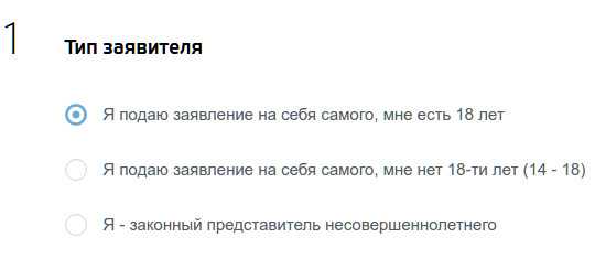 - Тип заявителя. Подается заявление лично или через законного представителя.