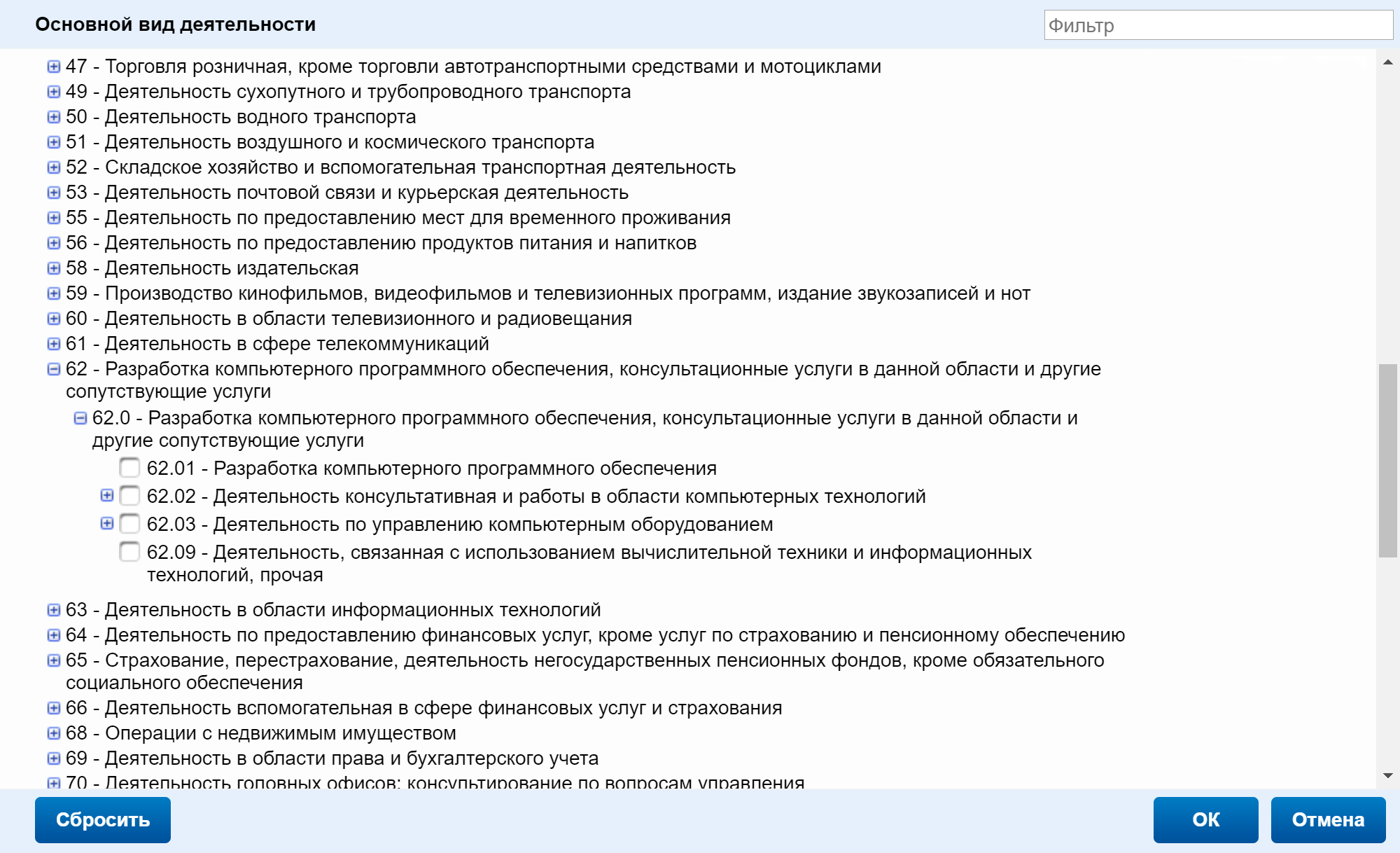 Для выбора кода выводится отдельное окно с полным списком и возможностью поиска. В нем нужно указать один основной код и сколько угодно дополнительных. Этот шаг требует больше всего внимания, потому что в кодах легко запутаться, а от вида деятельности зависит, например, нужна ли ИП лицензия и можно ли использовать упрощенную систему налогообложения — УСН.