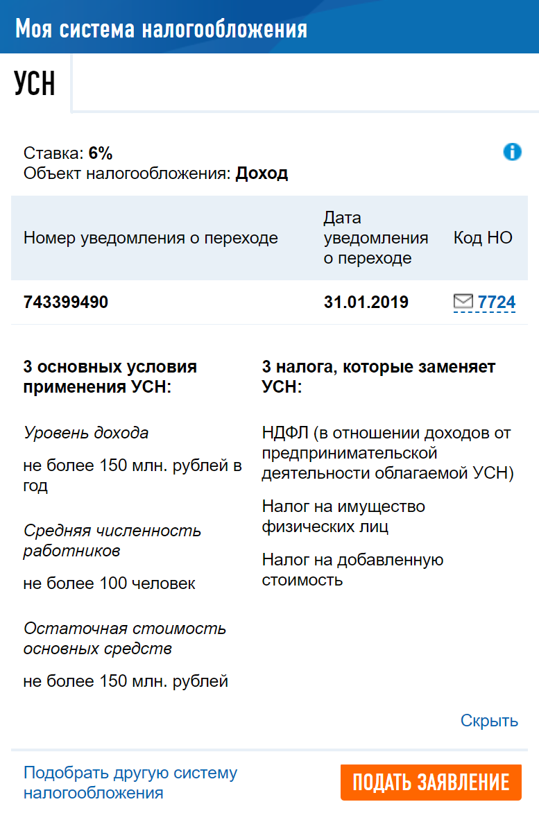 После регистрации ИП по умолчанию находится на общей системе налогообложения, где платит 13% с разницы между доходами и расходами. Моя деятельность не предполагает расходов, поэтому я перешел на упрощенную систему налогообложения, где платить надо только 6%, но расходы не учитываются. Это нужно сделать в течение 30 дней с момента регистрации, иначе придется ждать следующего года.