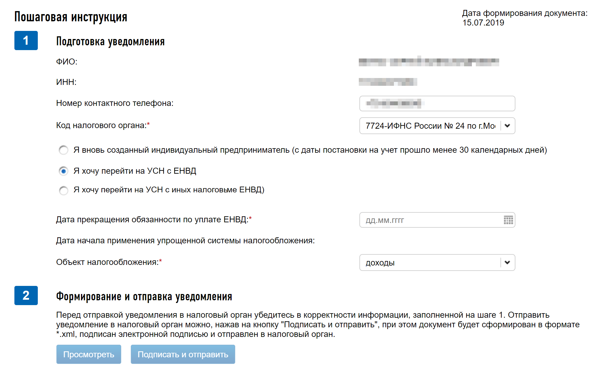 С электронной подписью сменить режим налогообложения тоже можно через сайт налоговой. Я зашел в личный кабинет ИП, нажал кнопку «Подать заявление», выбрал «Уведомление о переходе на упрощенную систему налогообложения», заполнил короткую форму, подписал уведомление электронной подписью и отправил его в налоговую.