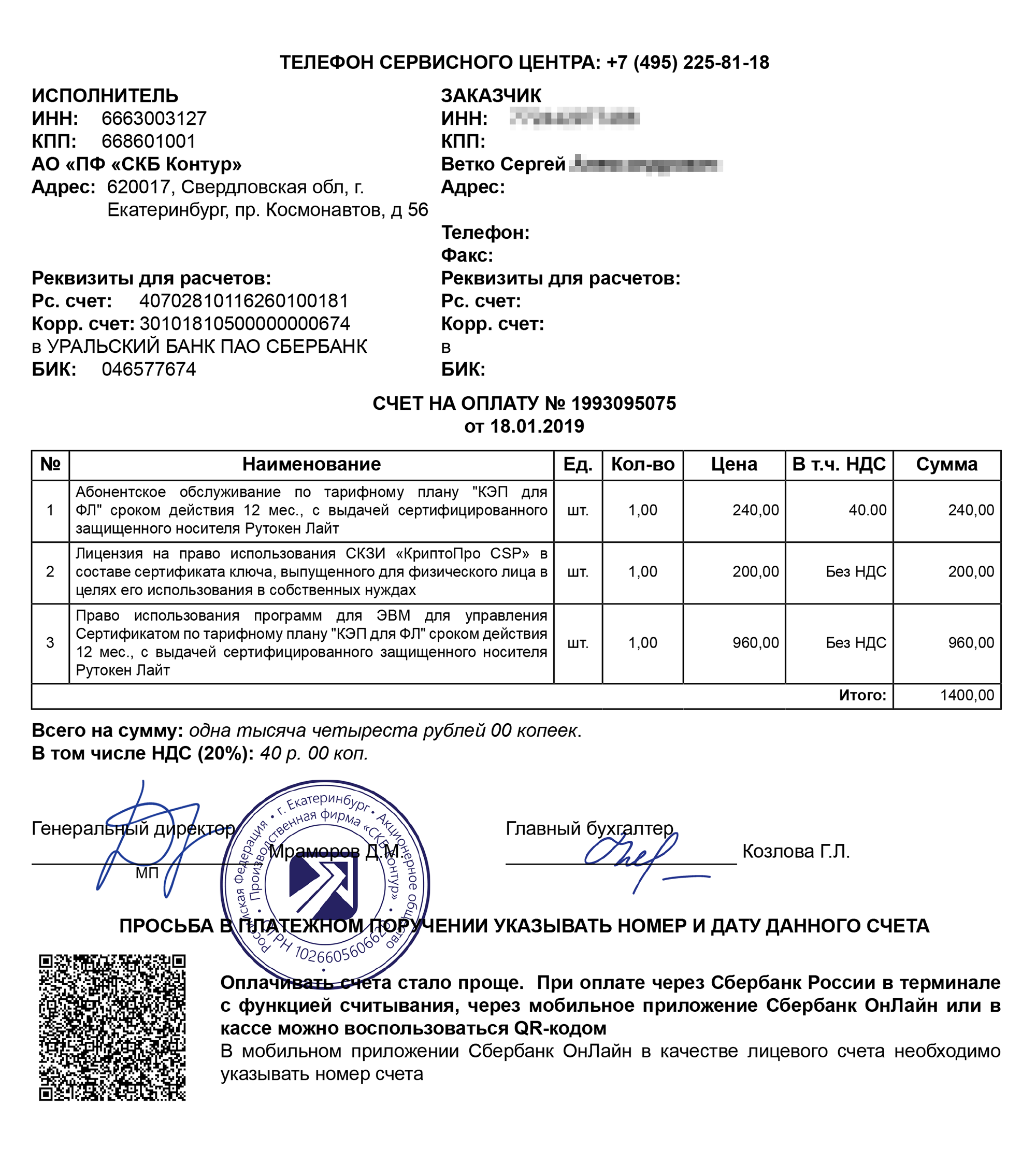 Счет на оплату своих услуг удостоверяющий центр прислал по электронной почте. Его можно оплатить банковским переводом по реквизитам или просканировать куар-код в мобильном приложении банка.