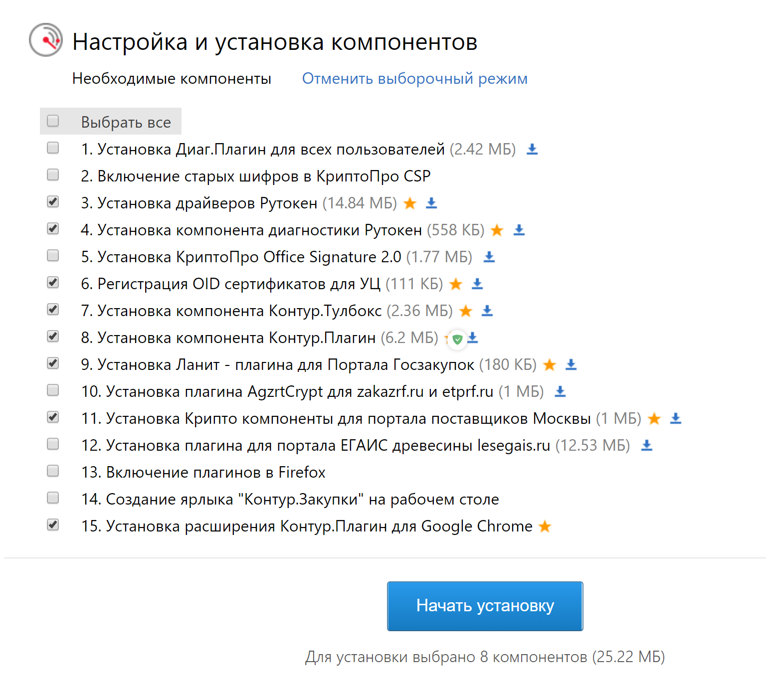 В процессе устанавливается много различных программ и плагинов, но от части из них можно отказаться. Например, я точно не использую браузер «Файрфокс» и не планирую участвовать в госзакупках, поэтому снял эти галочки. Но там, где не был уверен, оставил выбор по умолчанию.