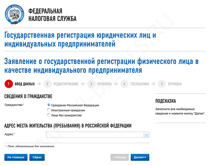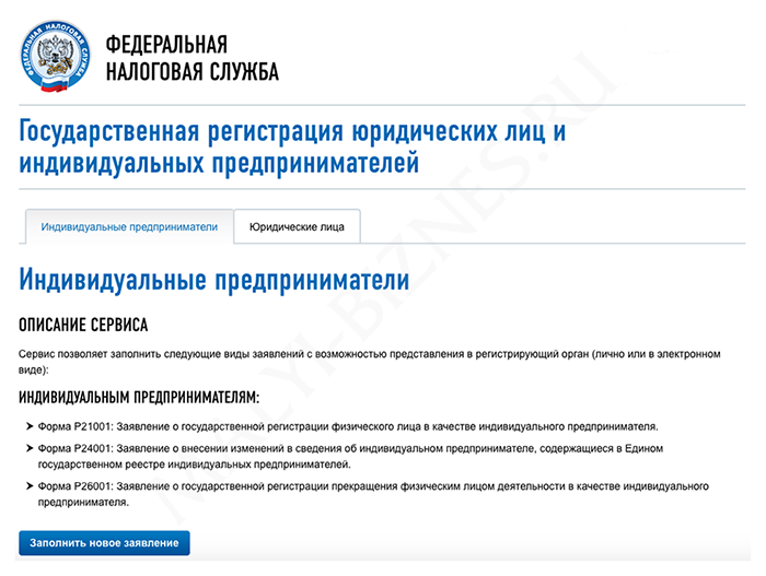 Сервис 1. Подача заявления для регистрации ИП на сайте налоговой