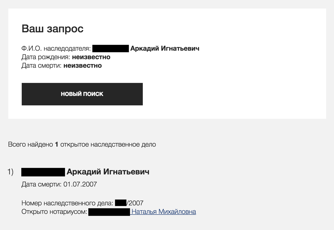 Перед визитом к нотариусу вы можете проверить, открыто ли наследственное дело и у кого оно находится. Воспользуйтесь сервисом на сайте Федеральной нотариальной палаты: введите в форму ФИО наследодателя и — если известны — дату рождения и смерти.
