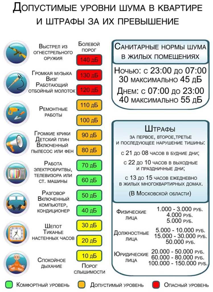 Ненаказуемый порог согласно закону — превышение в 5 дБа. При этом в зданиях, расположенных около автомагистралей и железнодорожных путей, порог шума может быть превышен на 10 дБа. Но только днем.